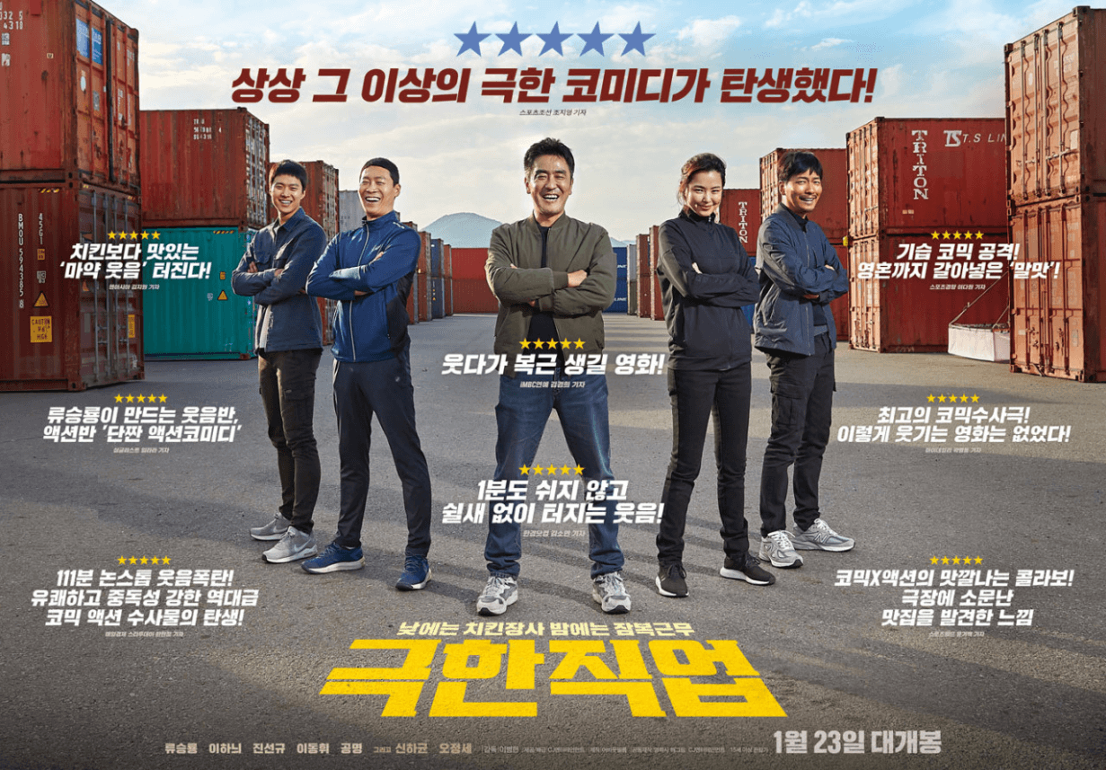 2019년 설날은 대작들의 축제였다. 극한직업은 대작들 중의 들러리 였다. 하지만 결과는 달랐다. 극한직업은 1,626만 명의 관객이 찾은 최고의 영화가 되었다. 류승룡, 이하늬, 진선규, 이동휘, 공명까지 잘 조화되어 최고의 영화가 만들어졌다. 이후로 수원 왕갈비 통닭은 치킨 골목의 최고의 브랜드가 되었다. 갈비 통닭의 달달함을 느끼고 싶은 분들에게 이 영화를 추천한다.