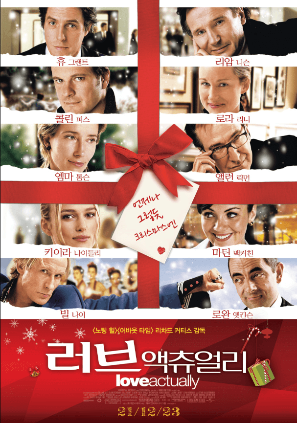 2003년 크리스마스를 겨냥한 영국영화 러브액츄얼리가 개봉하였다. 러브액츄얼리는 주인공이 여러 명인 만큼 각각의 상황에 맞는 에피소드들을 상황에 맞게 찍었다. 다양한 사랑의 종류에 헷갈렸던 것도 사실이었다. 하지만 종합선물세트 같은 느낌의 영화를 크리스마스에 보게 된 건 행운이었다.