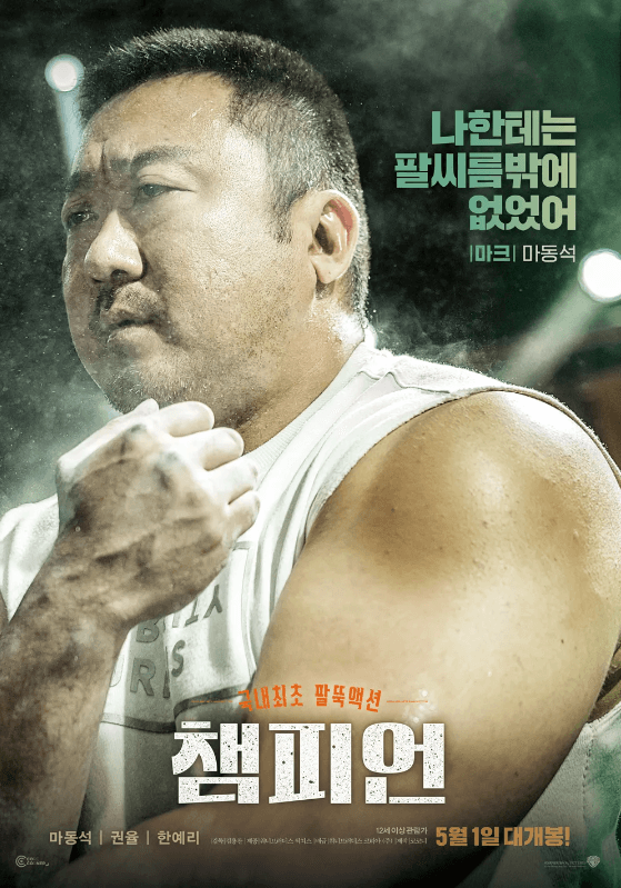 영화 챔피언은 마크 역의 마동석, 진기 역의 권율, 수진 역의 한예리가 있다. 마크는 입양아이다. 어렸을 때 미국으로 입양이 되었다. 할 수 있는 것이라고는 팔씨름 밖에 없었기에 최선을 다해서 팔씨름 선수가 되었다. 하지만 불의의 사고로 팔씨름 선수에서 제명되었다. 진기 역의 권율은 기생충 같은 역할이다. 마크 옆에서 매니저 역할을 하는 것 같지만, 결국 상금을 모두 빼앗아 가는 사람이다. 한국에 처음 도착한 날, 밥을 대접한다고 하면서 돌잔치에 데리고 가서 밥을 먹는다. 그리고 클럽을 데리고 간다. 마지막으로 잠은 허름한 모텔에서 재운다. 모든 스케줄이 있는 것처럼 말하지만, 결국 불법 팔씨름 대회를 만들어서 도박에 팔씨름 선수로 이용한다. 진기는 아버지 빚을 갚기 위해 노력하지만, 그 노력은 결국 마크의 몫이었다. 엄마의 집에 찾아간 마크는 수진과 아이들을 본다. 마크는 수진이 자기 동생이라고 생각한다. 수진은 아이 둘을 키우는 엄마다. 또한 동대문에서 옷을 팔면서 생계를 유지한다. 빚이 많이 있어서 매일 집으로 깡패가 찾아온다. 마크는 매일 집에 찾아오는 깡패를 막기 위해 수진의 집에서 같이 산다. 그리고 깡패가 올 때마다 돌려보낸다. 수진은 친엄마가 없지만 마크의 엄마를 친엄마처럼 모시면서 같이 산다. 유창수 역의 양현민은 깡패다. 진기는 유창수를 꼬셔 같이 불법 도박 사이트를 열어 돈을 번다. 준형 역의 최승훈과 준희 역의 옥예린은 수진의 아이들이다. 마크의 귀염둥이다.